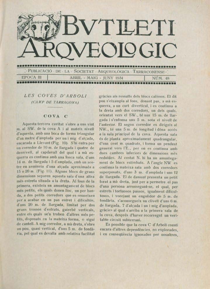 Vilaseca, Salvador. «Les Coves d’Arbolí (Camp de Tarragona)». Butlletí Arqueològic. Reial Societat Arqueològica Tarraconense, 1934, núm. 48, p. 341-56, https://raco.cat/index.php/ButlletiArq/article/view/334248.