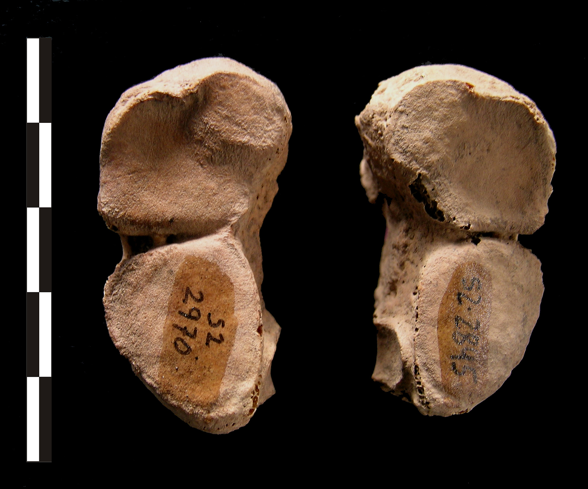 Figura 21. Dos calcanis que s’han trobat separats i que presenten una exostosi en el lloc d’inserció del tendó d’Aquílies, compatible amb una enteropatia. Degut a que comparteixen la mateixa mida, coloració, robustesa i patologia, es considera que podrien